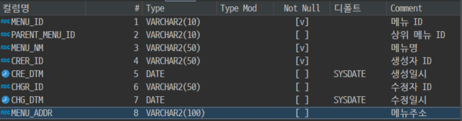 메뉴 마스터 테이블의 컬럼들인데 메뉴 주소는 프로그램 관리 테이블을 만들어 거기에 넣는 것이 더 좋지만,